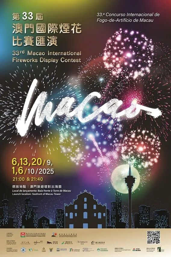 由澳門旅遊局主辦的第33屆澳門國際煙花比賽匯演於2025年9月6日至10月6日璀璨舉行。