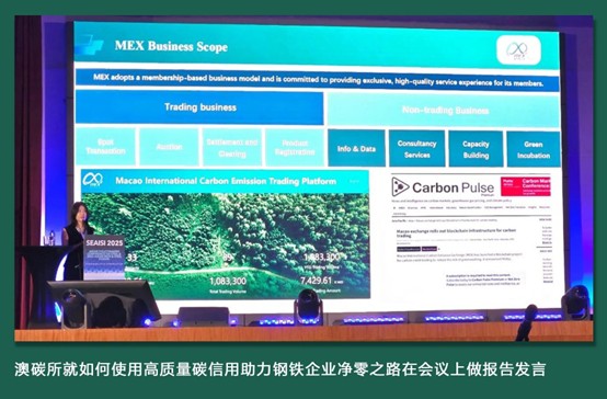 澳门国际碳排放交易所应邀出席本次会议,并就如何使用高质量碳信用助力钢铁企业净零之路在会议上做了报告发言。