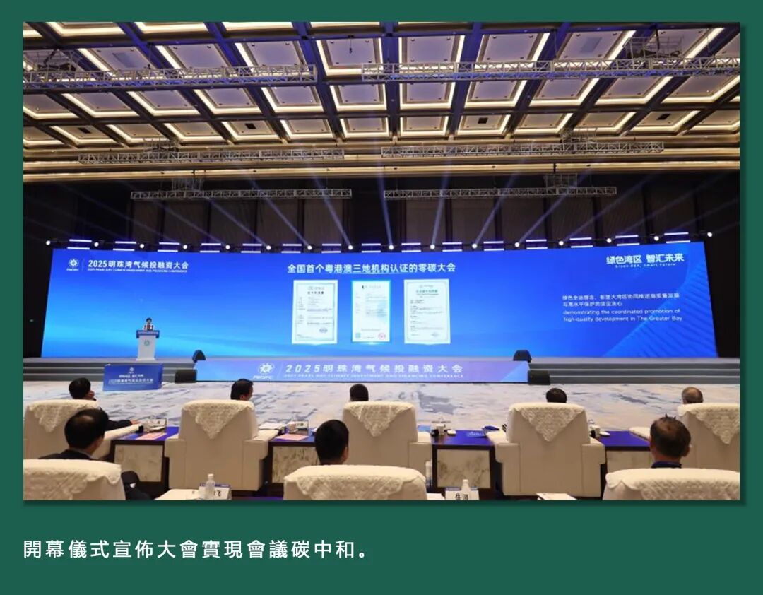 本次大會持續踐行綠色辦會理念,實現會議碳中和,並獲得了澳碳所、廣州碳交中心和中誠信綠金國際三家粵港澳專業機構的聯合認證——全國首個由粵港澳共同認證的碳中和國際會議,彰顯大灣區協同推進高質量發展與高水準保護的決心。